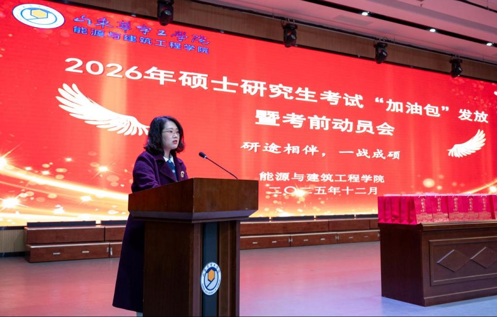 寒冬送暖,研途相伴。为鼓舞2026届考研学子士气,传递学院的深切关怀与坚定支持,能源与建筑工程学院于2025年12月15日,在大学生活动中心三馆隆重举行了“研途相伴,一战成硕”考研加油包发放仪式暨考前动员会。校长助理兼能源与建筑工程学院院长魏丰君、学院领导班子成员、本科毕业班级学业导师、本科毕业班级辅导员老师以及全体备战2026年全国硕士研究生招生考试的学生共同参加了此次活动。本次活动由学院党总支书记、副院长刘占凯主持。