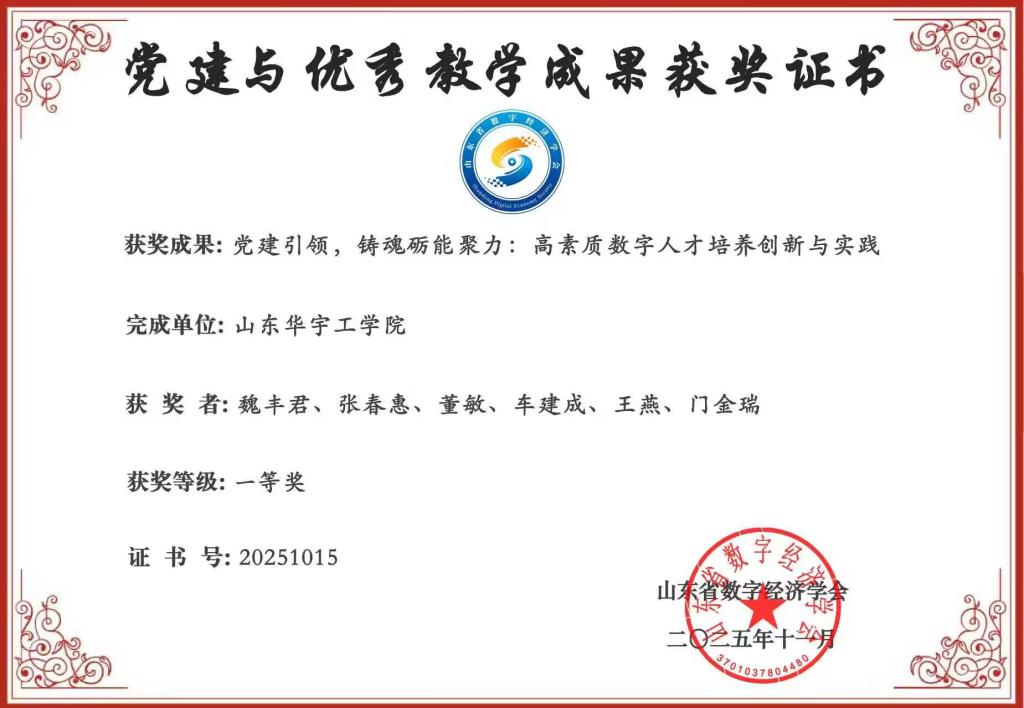 在山东省数字经济学会2025年度党建与优秀教学成果评选中,由魏丰君院长申报的《党建引领,铸魂砺能聚力:高素质数字人才培养创新与实践》项目荣获一等奖。